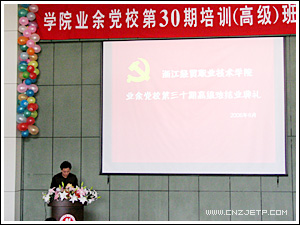 6月6日,学院在图书馆报告厅举行业余党校第三十期培训(高级)班结业典礼。典礼在雄壮的国歌声中拉开帷幕。院党委副书记潘素芳老师、院党委组织部部长李国华老师、学生处处长许兴苗老师等领导及各系党总支书记、辅导员老师和各班学生代表出席了本次典礼。典礼由党委宣传部部长潘春胜老师主持。